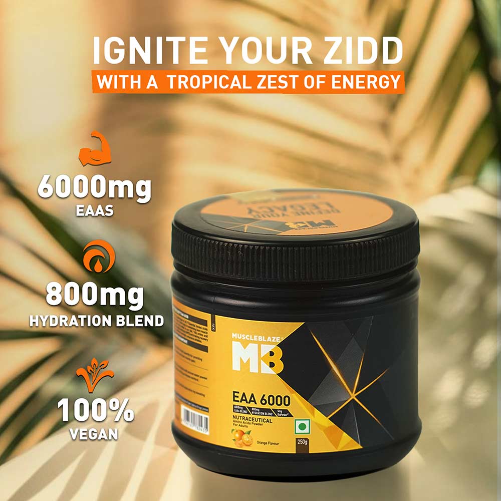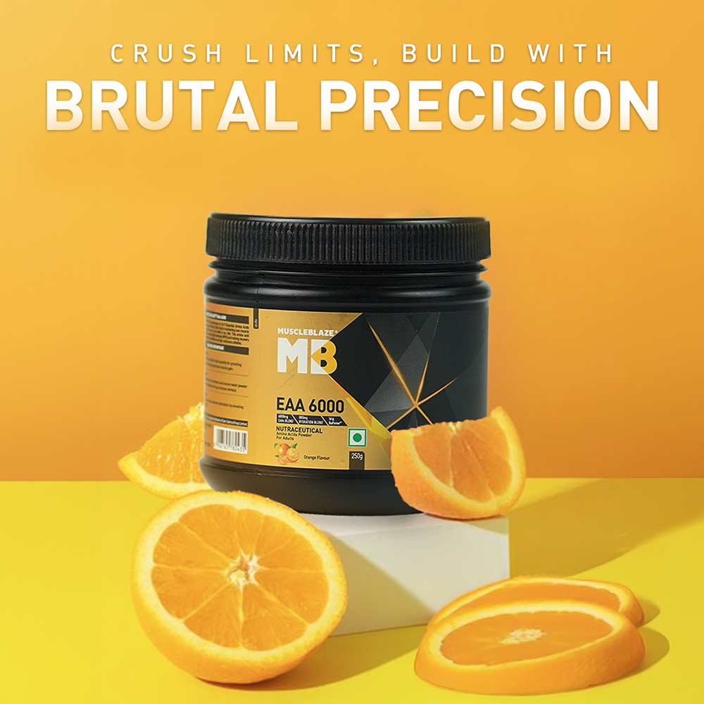 product.description.MUSCLEBLAZE EAA 6000, Orange FlavourFast muscle recovery is one of the most important aspects of bodybuilding as it helps you stay on track and keep achieving new fitness milestones faster as compared to long recovery time in-between the exercises. For advanced bodybuilders and beginners, muscle recovery is the first step to great results. Along with ample rest and a good workout routine, your body also needs great nutritional support that can help you power through each workout session. Get good muscle pumps and instant energy, stamina, and strength with the power of 9 Essential Amino Acids in MuscleBlaze EAA 6000 , the best EAA supplement in the market. Essential Amino Acids are among the most widely used supplements as they are easily absorbed and give your body the fuel that it needs to perform at its best abilities each time. MuscleBlaze EAA 6000 Intra Workout supplement in Orange Flavour is formulated especially keeping the constitution of your muscles in mind to aid faster recovery.